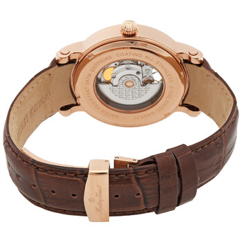 Rose gold-tone stainless steel case with a brown leather strap. Fixed rose gold-tone stainless steel bezel. Brown dial with rose gold-tone hands and index hour markers. Minute markers around the outer rim. Dial Type: Analog. Luminescent hands and markers. Landeron 24 automatic movement. Scratch resistant mineral crystal. Pull / push crown. Transparent case back. Round case shape, case size: 42 mm. Deployment with push button release clasp. Water resistant at 50 meters / 165 feet. Functions: hour, minute, second. Skeleton Series. Dress watch style. Watch label: Swiss Made. Mathey-Tissot Skeleton Automatic Brown Dial Men's Watch H7053PM.