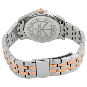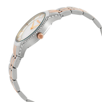Silver-tone stainless steel case with a two-tone (silver-tone and rose gold-tone) stainless steel bracelet. Fixed silver-tone zirconia set stainless steel bezel. Mother of pearl dial with rose gold-tone hands and index hour markers. Dial Type: Analog. Ronda Caliber 762 quartz movement. Scratch resistant mineral crystal. Pull / push crown. Solid case back. Round case shape, case size: 32 mm. Fold over clasp with a safety release. Water resistant at 50 meters / 165 feet. Functions: hour, minute. Additional Info: zirconia. Tacy Series. Casual watch style. Watch label: Swiss Made. Mathey-Tissot Tacy Quartz Ladies Watch D949BQI.