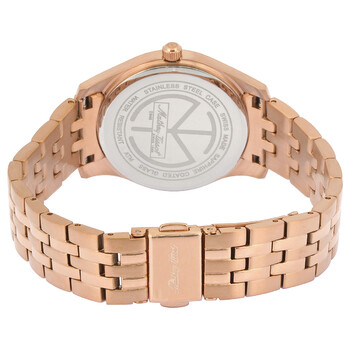 Rose gold-tone stainless steel case and bracelet. Fixed rose gold-tone stainless steel bezel. Mother of pearl dial with rose gold-tone hands and index hour markers. Dial Type: Analog. Ronda Caliber 762 quartz movement. Scratch resistant mineral crystal. Pull / push crown. Solid case back. Round case shape, case size: 32 mm. Fold over clasp with a safety release. Water resistant at 50 meters / 165 feet. Functions: hour, minute. Tacy Series. Casual watch style. Watch label: Swiss Made. Mathey-Tissot Tacy Quartz Ladies Watch D949RI.