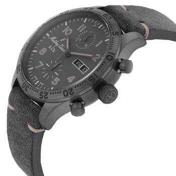 Gunmetal stainless steel case with a grey genuine leather strap. Fixed gunmetal stainless steel bezel. Grey dial with black hands and Arabic numeral hour markers. Minute markers around the outer rim. Dial Type: Analog. Luminescent hands and markers. Day of the week and date display at the 3 o'clock position. Chronograph - two sub-dials displaying: 60 second and 30 minute. Landeron 77 automatic movement. Scratch resistant mineral crystal. Pull / push crown. Transparent case back. Round case shape, case size: 42 mm. Water resistant at 50 meters / 165 feet. Functions: chronograph, day, date, hour, minute, second. Type 21 Chrono Auto Series. Casual watch style. Watch label: Swiss Made. Mathey-Tissot Type 21 Chrono Auto Chronograph Automatic Grey Dial Men's Watch H1821CHATLGO.