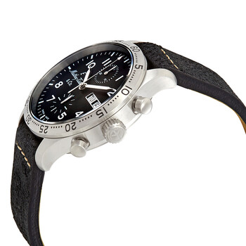 Silver-tone stainless steel case with a black leather strap. Fixed silver-tone stainless steel bezel. Black dial with luminous silver-tone hands and Arabic numeral hour markers. Minute markers around the outer rim. Dial Type: Analog. Luminescent hands. Day of the week and date display at the 3 o'clock position. Chronograph - two sub-dials displaying: 30 minute and 12 hour. Caliber Landeron 77 automatic movement. Scratch resistant sapphire crystal. Pull / push crown. Transparent case back. Round case shape, case size: 42 mm, case thickness: 11 mm. Band width: 20 mm. Fold over clasp with a push button release. Water resistant at 50 meters / 165 feet. Functions: chronograph, day, date, hour, minute, second. Type 21 Chrono Automatic Series. Sport watch style. Watch label: Swiss Made. Mathey-Tissot Type 21 Chrono Automatic Chronograph Black Dial Men's Watch H1821CHATLNG.