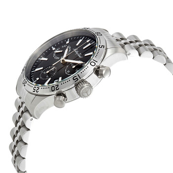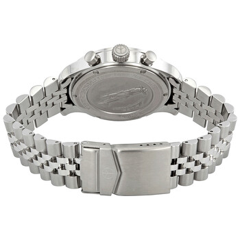 Stainless steel case with a stainless steel bracelet. Fixed stainless steel bezel. Black dial with luminous silver-tone hands and index hour markers. Minute markers around the outer rim. Dial Type: Analog. Luminescent hands and markers. Date display between the 4 and 5 o'clock positions. Chronograph - two sub-dials displaying: 60 second and 30 minute. Day of the week sub-dial. Ronda caliber Z60 quartz movement. Scratch resistant sapphire glass crystal. Pull / push crown. Solid case back. Round case shape. Case size: 42 mm. Case thickness: 11 mm. Band width: 20 mm. Fold over clasp with a safety release. Water resistant at 50 meters / 165 feet. Functions: chronograph, date, day, hour, minute, small second. Casual watch style. Watch label: Swiss Made. Mathey-Tissot Type 22 Chronograph Black Dial Men's Watch H1822CHAN.