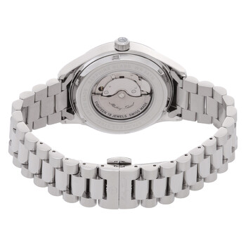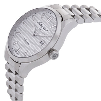 Silver-tone stainless steel case and bracelet. Fixed silver-tone stainless steel bezel. Silver-tone dial with silver-tone hands and index hour markers. Minute markers around the outer rim. Dial Type: Analog. Luminescent hands. Date display at the 3 o'clock position. Automatic movement. Scratch resistant sapphire crystal. Pull / push crown. Transparent case back. Round case shape, case size: 42 mm. Fold over clasp with a safety release. Water resistant at 50 meters / 165 feet. Functions: date, hour, minute, second. Urban Auto Series. Casual watch style. Watch label: Swiss Made. Mathey-Tissot Urban Auto Automatic Silver Dial Men's Watch H411ATAS.