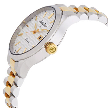 Silver-tone stainless steel case with a two-tone (silver-tone and yellow gold-tone) stainless steel bracelet. Fixed silver-tone stainless steel bezel. Silver-tone dial with yellow gold-tone hands and index hour markers. Minute markers around the outer rim. Dial Type: Analog. Luminescent hands. Date display at the 3 o'clock position. Automatic movement. Scratch resistant sapphire crystal. Pull / push crown. Transparent case back. Round case shape, case size: 42 mm. Fold over clasp with a safety release. Water resistant at 50 meters / 165 feet. Functions: date, hour, minute, second. Urban Auto Series. Casual watch style. Watch label: Swiss Made. Mathey-Tissot Urban Auto Automatic Silver Dial Men's Watch H411ATBI.