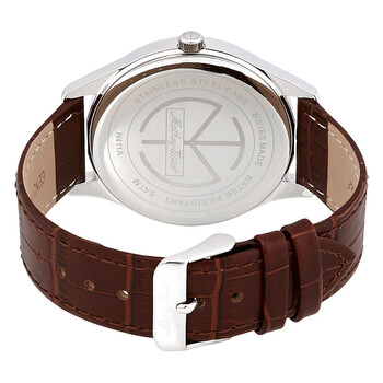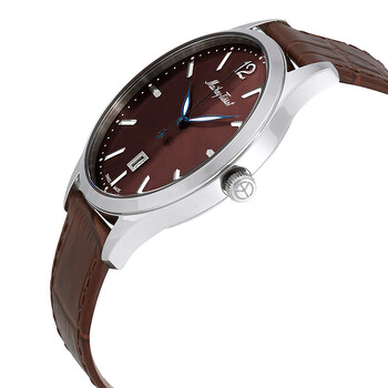 Stainless steel case with a brown leather strap. Fixed stainless steel bezel. Brown dial with luminous blue hands and index hour markers. An Arabic numeral appears at the 12 o'clock position. Minute markers around the outer rim. Dial Type: Analog. Luminescent hands and markers. Date display at the 6 o'clock position. Ronda caliber 515 quartz movement. Scratch resistant sapphire crystal. Pull / push crown. Solid case back. Round case shape. Case size: 42 mm. Case thickness: 8 mm. Band width: 20 mm. Tang clasp. Water resistant at 50 meters / 165 feet. Functions: date, hour, minute, second. Urban Series. Casual watch style. Watch label: Swiss Made. Mathey-Tissot Urban Brown Dial Brown Leather Men's Watch H411AM.