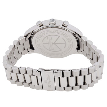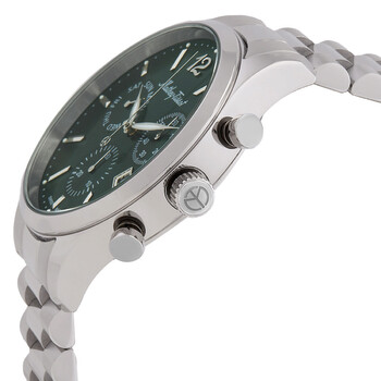 Silver-tone stainless steel case and bracelet. Fixed silver-tone stainless steel bezel. Green dial with silver-tone hands and Arabic & index hour markers. Minute markers around the outer rim. Dial Type: Analog. Luminescent hands. Date display at the 4 o'clock position. Chronograph - sub-dials displaying: day. Ronda Caliber Z60 quartz movement. Scratch resistant mineral crystal. Pull / push crown. Solid case back. Round case shape, case size: 42 mm. Fold over clasp with a safety release. Water resistant at 50 meters / 165 feet. Functions: chronograph, date, day, hour, minute, small second. Urban Chrono Series. Casual watch style. Watch label: Swiss Made. Mathey-Tissot Urban Chrono Chronograph Quartz Green Dial Men's Watch H411CHAV.