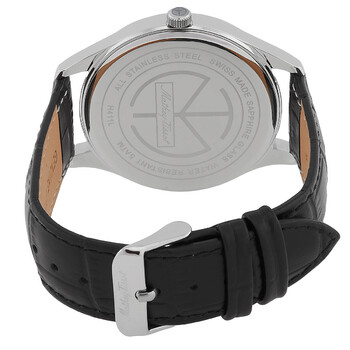 Silver-tone stainless steel case with a black genuine leather strap. Fixed silver-tone stainless steel bezel. Black dial with silver-tone hands and Arabic hour markers. Minute markers around the outer rim. Dial Type: Analog. Luminescent hands. Date display at the 6 o'clock position. One subdial displaying: moonphase. Ronda Caliber 708 quartz movement. Scratch resistant mineral crystal. Pull / push crown. Solid case back. Round case shape, case size: 42 mm. Tang clasp. Functions: moon phase, date, hour, minute, second, battery eol indicator. Urban Moon Series. Casual watch style. Watch label: Swiss Made. Mathey-Tissot Urban Moon Quartz Moon Phase Black Dial Men's Watch H411ALAN.