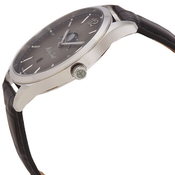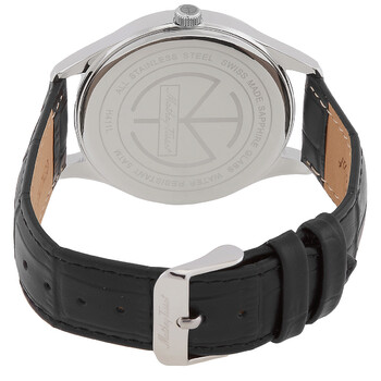 Silver-tone stainless steel case with a black genuine leather strap. Fixed silver-tone stainless steel bezel. Black dial with silver-tone hands and Arabic numeral & index hour markers. Minute markers around the outer rim. Dial Type: Analog. Luminescent hands. Date display at the 6 o'clock position. One subdial displaying: moonphase. Ronda Caliber 708 quartz movement. Scratch resistant mineral crystal. Pull / push crown. Solid case back. Round case shape, case size: 42 mm. Tang clasp. Functions: moon phase, date, hour, minute, second, battery eol indicator. Urban Moon Series. Casual watch style. Watch label: Swiss Made. Mathey-Tissot Urban Moon Quartz Moon Phase Black Dial Men's Watch H411LAN.