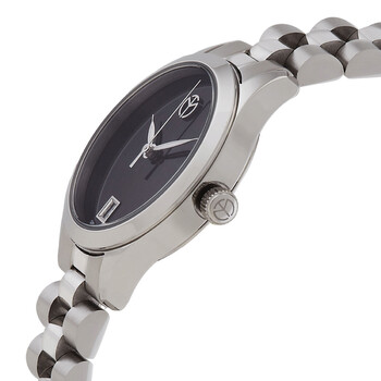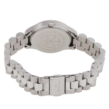 Silver-tone stainless steel case and bracelet. Fixed silver-tone stainless steel bezel. Black dial with silver-tone hands. Dial Type: Analog. Luminescent hands. Date display at the 6 o'clock position. Ronda Caliber 585 quartz movement. Scratch resistant mineral crystal. Pull / push crown. Solid case back. Round case shape, case size: 30 mm. Fold over clasp with a safety release. Functions: date, hour, minute, second. Urban Series. Casual watch style. Watch label: Swiss Made. Mathey-Tissot Urban Quartz Black Dial Ladies Watch D411MNM.