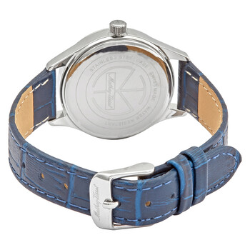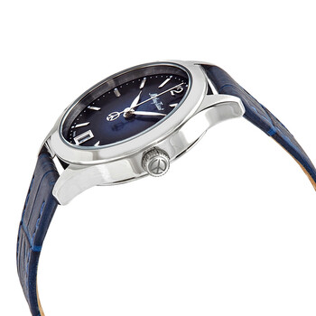 316L stainless steel case with a blue leather strap. Fixed 316L stainless steel bezel. Blue dial with luminous silver-tone hands and index hour markers. An Arabic numeral appears at the 12 o'clock position. Minute markers around the outer rim. Dial Type: Analog. Luminescent hands and markers. Date display at the 6 o'clock position. Ronda caliber 586 H6 quartz movement. Scratch resistant sapphire crystal. Pull / push crown. Solid case back. Round case shape. Case size: 30 mm. Case thickness: 4 mm. Band width: 20 mm. Tang clasp. Water resistant at 50 meters / 165 feet. Functions: date, hour, minute, second. Casual watch style. Watch label: Swiss Made. Mathey-Tissot Urban Quartz Blue Dial Ladies Watch D411ABU.
