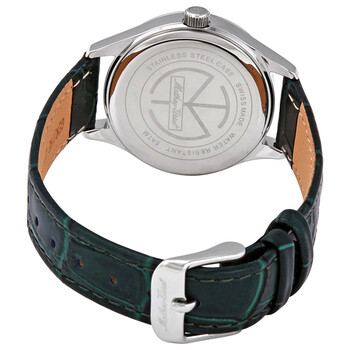 Stainless steel case with a green leather strap. Fixed stainless steel bezel. Green dial with luminous silver-tone hands and index hour markers. An Arabic numeral marks the 12 o'clock position. Minute markers around the outer rim. Dial Type: Analog. Luminescent hands and markers. Date display at the 6 o'clock position. Ronda caliber 586 H6 quartz movement. Scratch resistant sapphire crystal. Pull / push crown. Solid case back. Round case shape. Case size: 30 mm. Case thickness: 4 mm. Band width: 20 mm. Tang clasp. Water resistant at 50 meters / 165 feet. Functions: date, hour, minute, second. Casual watch style. Watch label: Swiss Made. Mathey-Tissot Urban Quartz Green Dial Ladies Watch D411AV.