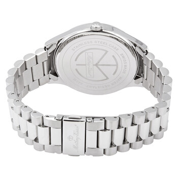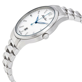 Stainless steel case with a stainless steel bracelet. Fixed stainless steel bezel. Silver dial with luminous blue leaf-style shape hands and index hour markers. An Arabic numeral appears at the 12 o'clock position. Minute markers around the outer rim. Dial Type: Analog. Luminescent hands and markers. Date display above the 6 o'clock position. Ronda caliber 515.H6 quartz movement. Scratch resistant sapphire crystal. Pull / push crown. Solid case back. Round case shape. Case size: 42 mm. Case thickness: 8 mm. Band width: 20 mm. Fold over clasp with a push button release. Water resistant at 50 meters / 165 feet. Functions: date, hour, minute, second. Urban Series. Casual watch style. Watch label: Swiss Made. Mathey-Tissot Urban Quartz Silver Dial Men's Watch H411MAI.