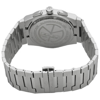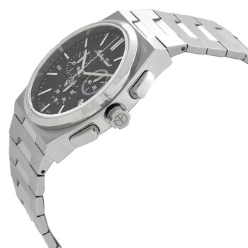 Silver-tone stainless steel case and bracelet. Fixed silver-tone stainless steel bezel. Black dial with silver-tone hands and index hour markers. Minute markers around the outer rim. Dial Type: Analog. Luminescent hands and markers. Date display at the 4 o'clock position. Chronograph - three sub-dials displaying: 60 second, 30 minute and 12 hour. Ronda Caliber 5030.D quartz movement. Scratch resistant sapphire crystal. Pull / push crown. Solid case back. Round case shape, case size: 41 mm, case thickness: 11.5 mm. Band width: 12 mm. Deployment with push button release clasp. Water resistant at 50 meters / 165 feet. Functions: chronograph, date, hour, minute, small second. Zeus Series. Sport watch style. Watch label: Swiss Movt. Mathey-Tissot Zeus Chronograph Quartz Black Dial Men's Watch H118CHAN.
