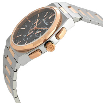 Silver-tone stainless steel case with a two-tone (silver-tone and rose gold-tone) stainless steel bracelet. Fixed rose gold-tone stainless steel bezel. Black dial with rose gold-tone hands and index hour markers. Minute markers around the outer rim. Dial Type: Analog. Luminescent hands and markers. Date display at the 4 o'clock position. Chronograph - three sub-dials displaying: 60 second, 30 minute and 12 hour. Ronda Caliber 5030.D quartz movement. Scratch resistant sapphire crystal. Pull / push crown. Solid case back. Round case shape, case size: 41 mm, case thickness: 11.5 mm. Band width: 12 mm. Deployment with push button release clasp. Water resistant at 50 meters / 165 feet. Functions: chronograph, date, hour, minute, small second. Zeus Series. Sport watch style. Watch label: Swiss Movt. Mathey-Tissot Zeus Chronograph Quartz Black Dial Men's Watch H118CHRS.
