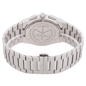 Silver-tone stainless steel case and bracelet. Fixed silver-tone stainless steel bezel. Blue dial with silver-tone hands and index hour markers. Minute markers around the outer rim. Dial Type: Analog. Luminescent hands and markers. Date display at the 4 o'clock position. Chronograph - three sub-dials displaying: 60 second, 30 minute and 12 hour. Ronda Caliber 5030.D quartz movement. Scratch resistant sapphire crystal. Pull / push crown. Solid case back. Round case shape, case size: 41 mm, case thickness: 11.5 mm. Band width: 12 mm. Deployment with push button release clasp. Water resistant at 50 meters / 165 feet. Functions: chronograph, date, hour, minute, small second. Zeus Series. Sport watch style. Watch label: Swiss Movt. Mathey-Tissot Zeus Chronograph Quartz Blue Dial Men's Watch H118CHSK.
