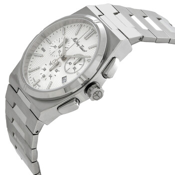 Silver-tone stainless steel case and bracelet. Fixed silver-tone stainless steel bezel. Silver dial with silver-tone hands and index hour markers. Minute markers around the outer rim. Dial Type: Analog. Luminescent hands and markers. Date display at the 4 o'clock position. Chronograph - three sub-dials displaying: 60 second, 30 minute and 12 hour. Ronda Caliber 5030.D quartz movement. Scratch resistant sapphire crystal. Pull / push crown. Solid case back. Round case shape, case size: 41 mm, case thickness: 11.5 mm. Band width: 12 mm. Deployment with push button release clasp. Water resistant at 50 meters / 165 feet. Functions: chronograph, date, hour, minute, small second. Zeus Series. Sport watch style. Watch label: Swiss Movt. Mathey-Tissot Zeus Chronograph Quartz Silver Dial Men's Watch H118CHAS.