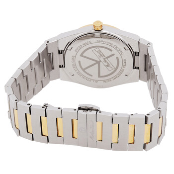 Silver-tone stainless steel case with a two-tone (silver-tone and yellow gold-tone) stainless steel bracelet. Fixed yellow gold-ton stainless steel bezel set with zirconia. White dial with gold-tone hands and diamond hour markers. Minute markers around the outer rim. Dial Type: Analog. Luminescent hands. Date display at the 3 o'clock position. Ronda Caliber 585 quartz movement. Scratch resistant sapphire crystal. Pull / push crown. Solid case back. Round case shape, case size: 34 mm, case thickness: 9 mm. Band width: 10 mm. Water resistant at 50 meters / 165 feet. Functions: date, hour, minute, second. Zeus Lady Diamond Series. Dress watch style. Watch label: Swiss Movt. Mathey-Tissot Zeus Lady Diamond Quartz White Dial Ladies Watch D118SBYI.