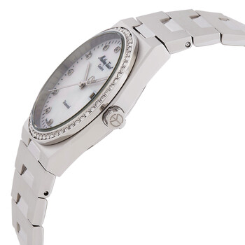 Silver-tone stainless steel case and bracelet. Fixed zirconia stainless steel bezel. White dial with silver-tone hands and diamond hour markers. Minute markers around the outer rim. Dial Type: Analog. Luminescent hands. Date display at the 3 o'clock position. Ronda Caliber 585 quartz movement. Scratch resistant sapphire crystal. Pull / push crown. Solid case back. Round case shape, case size: 34 mm, case thickness: 9 mm. Band width: 10 mm. Water resistant at 50 meters / 165 feet. Functions: date, hour, minute, second. Zeus Lady Diamond Series. Dress watch style. Watch label: Swiss Movt. Mathey-Tissot Zeus Lady Diamond Quartz White Dial Watch D118SAI.