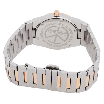 Silver-tone stainless steel case with a two-tone (silver-tone and rose gold-tone) stainless steel bracelet. Fixed rose gold-tone stainless steel bezel set with zirconia. White dial with rose gold-tone hands and diamond hour markers. Minute markers around the outer rim. Dial Type: Analog. Luminescent hands. Date display at the 3 o'clock position. Ronda Caliber 585 quartz movement. Scratch resistant sapphire crystal. Pull / push crown. Solid case back. Round case shape, case size: 34 mm, case thickness: 9 mm. Band width: 10 mm. Water resistant at 50 meters / 165 feet. Functions: date, hour, minute, second. Zeus Lady Diamond Series. Dress watch style. Watch label: Swiss Movt. Mathey-Tissot Zeus Lady Diamond Quartz White Dial Watch D118SBI.
