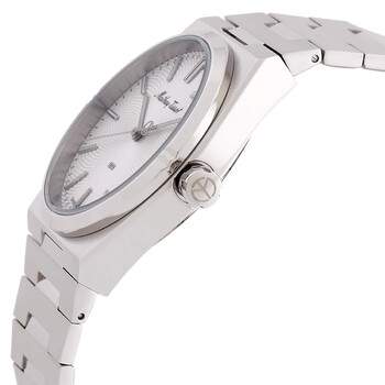 Silver-tone stainless steel case and bracelet. Fixed silver-tone stainless steel bezel. Silver-tone dial with silver-tone hands and index hour markers. Minute markers around the outer rim. Dial Type: Analog. Luminescent hands and markers. Date display at the 3 o'clock position. Ronda Caliber 515 quartz movement. Scratch resistant sapphire crystal. Pull / push crown. Solid case back. Round case shape, case size: 41 mm. Fold over clasp with a safety release. Functions: date, hour, minute, second. Zeus Series. Casual watch style. Watch label: Swiss Made. Mathey-Tissot Zeus Silver-tone Dial Men's Watch H118AS.