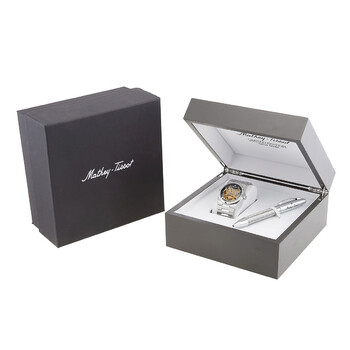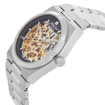Silver-tone stainless steel case and bracelet. Fixed silver-tone stainless steel bezel. Black dial with silver-tone hands and index hour markers. Minute markers around the outer rim. Dial Type: Analog. Luminescent hands and markers. Catena S800 automatic movement. Scratch resistant sapphire crystal. Pull / push crown. Transparent case back. Round case shape, case size: 41 mm. Fold over clasp with a safety release. Water resistant at 50 meters / 165 feet. Functions: hour, minute, second. Zeus Skeleton Series. Casual watch style. Watch label: Swiss Made. Mathey-Tissot Zeus Skeleton Automatic Black Dial Men's Watch H118CFAN.