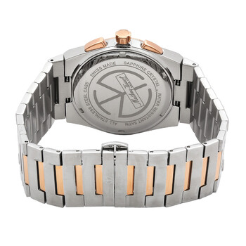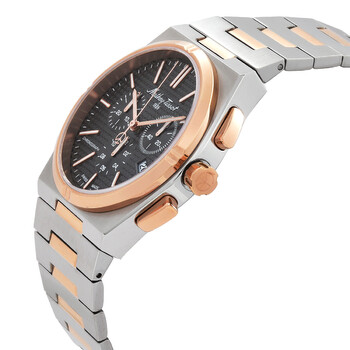 Two-tone (silver-tone and rose gold-tone) stainless steel case and bracelet. Fixed silver-tone rose gold-tone bezel. Gray dial with rose gold-tone hands and index hour markers. Minute scale around the inner rim. Dial Type: Analog. Luminescent hands and markers. Date display at the 4 o'clock position. Chronograph - three sub-dials displaying: 60 second, 30 minute and 12 hour. Ronda Caliber 5030.D quartz movement. Scratch resistant sapphire crystal. Pull / push crown. Solid case back. Round case shape, case size: 41 mm. Fold over clasp with a safety release. Water resistant at 50 meters / 165 feet. Functions: chronograph, date, hour, minute, small second. Zoltan Chrono Series. Sport watch style. Watch label: Swiss Movt. Mathey-Tissot Zoltan Chrono Chronograph Quartz Men's Watch H117CHRS.