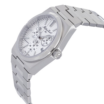 Silver-tone stainless steel case and bracelet. Fixed silver-tone stainless steel bezel. Silver dial with silver-tone hands and index hour markers. Minute scale around the inner rim. Dial Type: Analog. Luminescent hands and markers. Date display at the 4 o'clock position. Chronograph - three sub-dials displaying: 60 second, 30 minute and 1/10th of a second. Ronda Caliber 5030.D quartz movement. Scratch resistant sapphire crystal. Pull / push crown. Solid case back. Round case shape, case size: 41 mm. Fold over clasp with a safety release. Water resistant at 50 meters / 165 feet. Functions: chronograph, date, hour, minute, small second. Zoltan Chrono Series. Sport watch style. Watch label: Swiss Movt. Mathey-Tissot Zoltan Chrono Chronograph Quartz Silver Dial Men's Watch H117CHAS.