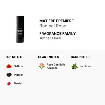 At the heart of Radical Rose is the rich and captivating Rose Centifolia Absolute, sourced to highlight its natural beauty and depth. The opening notes spark curiosity with a vibrant blend of saffron, pepper, and berries, creating a warm and spicy introduction. As the scent settles, earthy patchouli adds a grounded, lasting finish that lingers gracefully throughout the day.