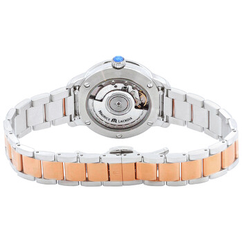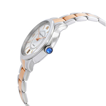 Silver-tone stainless steel case with a two-tone (silver-tone and rose gold-tone) stainless steel bracelet. Fixed silver-tone stainless steel bezel. Mother of pearl dial with rose gold-tone hands and index hour markers. Minute markers around the outer rim. Dial Type: Analog. Date display at the 6 o'clock position. Sellita Calibre SW300 Automatic movement, containing 25 Jewels, bitting at 28800 vph, and has a power reserve of approximately 38 hours. Scratch resistant sapphire crystal. Solid case back. Round case shape, case size: 34 mm. Fold over clasp with a safety release. Water resistant at 100 meters / 330 feet. Functions: date, hour, minute, second. Pontos Series. Dress watch style. Watch label: Swiss Made. Maurice Lacroix Pontos Automatic Ladies Watch PT6006-PVP0E-120-F.