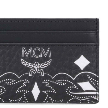 MCM Men's Card Case. SKU: MXADATA07BK. Color: Black. Size: Width: 10.5cm x Height: 7cm x Depth: 0.5cm. Mcm Aren Bandana Card Case. The Aren card holder is crafted from leather, featuring a white logo print on the front and a white motif print. It includes two card slots on the front and two card slots on the back for convenient storage. Material: 100% Canvas, 100% Leather, Made in South Korea.