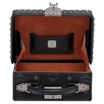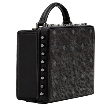 MCM Ladies Crossbody. SKU: MWR5ABN01BK. Color: Black. Size: 7.5" x 5.5" x 3". This crossbody bag features a coated canvas body with leather trim, accented by studs. It has a suede-lined interior with a cardholder, a plunger snap closure, and protective feet at the bottom. Designed for versatility, it includes a 2-inch drop top handle and a 24-inch adjustable, removable shoulder strap.