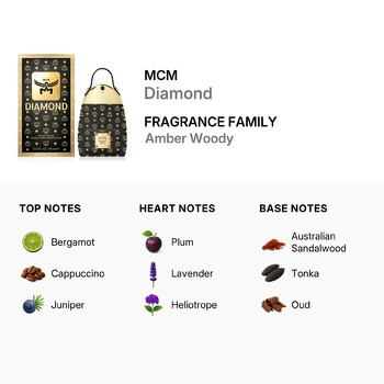 Indulge in the radiant allure of MCM Diamond Eau de Parfum and elevate your fragrance game with this stunning blend of rich woods, soft florals, and warm spices. Available for shipment within the Contiguous United States and Canada.