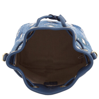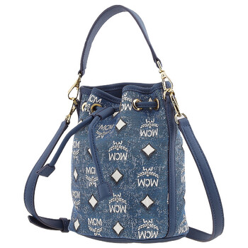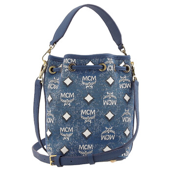 Mcm Ladies Bucket Bag. SKU: MWDDSDU08LE001. Barcode: 8809735127141. Color: Blue. Size: 3.9 x 5.5 x 7.9 inches. Mcm Ladies Dessau Drawstring In Vintage Denim Jacquard - Blue. Crafted from Italian denim with a jacquard monogram pattern, this design features a drawstring closure, a detachable half-round handle, a detachable and adjustable shoulder strap, and a single internal compartment.