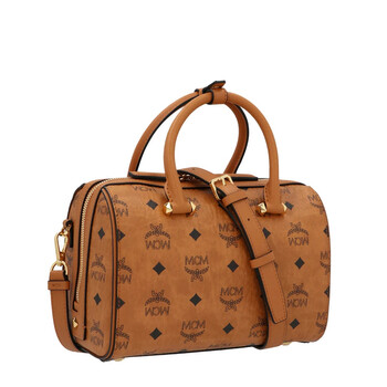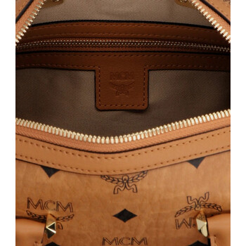 MCM Ladies Boston Bag. SKU: MWBAASE02CO. Barcode: 8809675883077. Color: Cognac. Size: 5.9 x 9.1 x 4.3 inches. MCM Ladies Essential Boston Bag in Cognac Visetos Original. Crafted in signature Visetos coated canvas, this bag features two way zip closure, dual round top handles, a removable, adjustable crossbody strap, a removable leather covered metal logo hangtag, a main compartment with an interior open pocket and zip pocket and MCM logo plate.