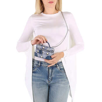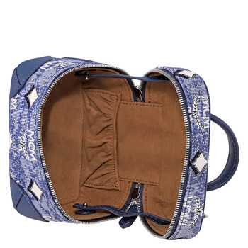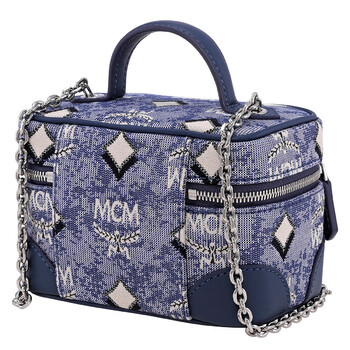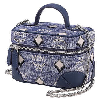 MCM Ladies Crossbody. SKU: MWRBATQ02LU. Barcode: 8809735036641. Color: Blue. Size: 9.0 x 13.5 x 8.5 cm. MCM Ladies X-Mini Blue Rockstar Vanity Case in Vintage Jacquard Monogram. Crafted from jacquard woven fabric and nappa leather, this bag features two-way zip around closure, a main compartment with an interior open pocket, a single leather top handle with a 4 cm drop and a removable chain strap.