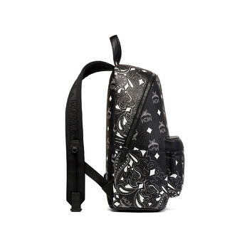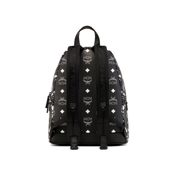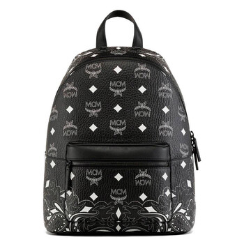 MCM Unisex Backpack. SKU: MMKDAVE05BK001. Color: Black. The Mini Stark Backpack offers a versatile blend of style and function, effortlessly converting into a crossbody bag with its detachable, adjustable straps. Crafted with MCM’s signature craftsmanship, it features a leather top handle, a secure zip closure, and a front zip pocket for easy access. The spacious interior compartment is lined with cotton twill for a refined touch, while dark metal hardware and the iconic MCM logo plate complete its modern, edgy aesthetic. Approximately 3.3 x 6.3 x 7.7 inches. 30.3" to 45.9" strap length, handle drop: 2". Made in South Korea.
