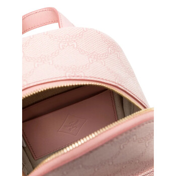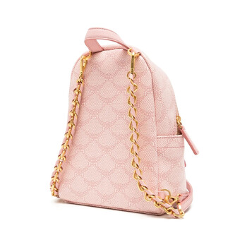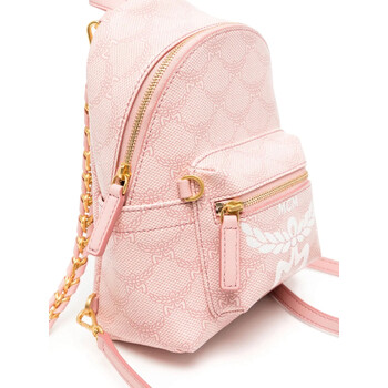 MCM Ladies Backpack. SKU: MMKESVE03P6001. Color: Pink. Size: 3.3 x 6.7 x 8.7 inches. The Bebe Boo backpack is crafted from Lauretos monogram canvas and features detachable, adjustable chain shoulder straps for crossbody conversion. It has a front zip pocket with the MCM logo print, exterior side pockets, and a zip closure. Inside, you'll find card slots, nappa leather trim, and cotton-linen lining, all finished with 24k gold-plated brass hardware for a luxurious touch.