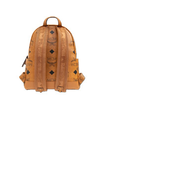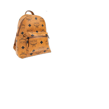 MCM Men's Backpack. SKU: MMKESVE01CO. Color: Cognac. Size: 13"W x 6.5"D x 16.5"H. MCM Stark Maxi MN VI Backpack. This backpack features a leather top handle with a 3" drop, adjustable shoulder straps ranging from 29.5" to 35" in length, a zip closure, a front zip pocket, a spacious main compartment, two water bottle holders, a laptop slit, a padded back panel, matte black metal hardware, and a microfiber lining with a suede finish.