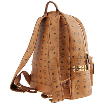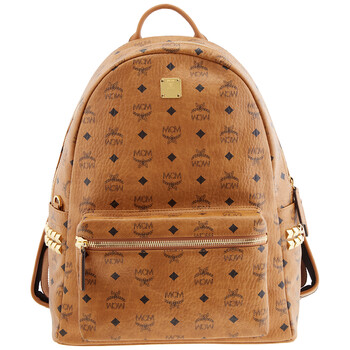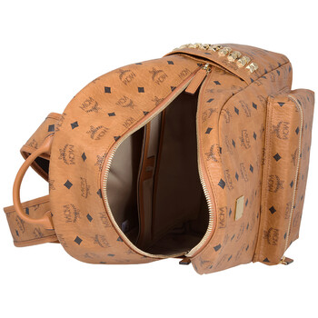 Mcm Unisex Backpack. SKU: MMKAAVE09CO001. Barcode: 8809675893991. Color: Cognac. Size: 41 x 33.5 x 15.5 cm. MCM Visetos Stark Studs Medium Backpack - Cognac. Made from signature Visetos coated canvas with a luxurious nappa leather trim, this structured backpack features a two-way zip around closure, 24k gold-plated hardware, side open pockets, front zip pocket, adjustable shoulder straps, cotton twill lining, a spacious interior and pyramid stud trim.