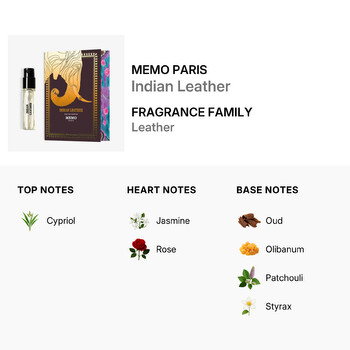 Belonging to the leather fragrance family, Indian Leather opens with a striking top note of cypriol, setting a smoky and earthy tone. As the scent unfolds, floral heart notes of jasmine and rose add a delicate richness that balances the boldness of the leather. The base reveals a warm and sensual blend of oud, olibanum, patchouli, styrax, and vanilla bean, creating a deep and lasting impression.