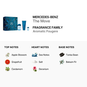 The Mercedes-Benz The Move Gift Set includes a 100ml Eau de Toilette, a 7ml travel-size EDT, and a 100ml shower gel—making it the ideal companion for daily wear or as a stylish gift. The fragrance opens with fresh and energizing notes of apple blossom, grapefruit, and cardamom. These bright top notes lead into a refreshing heart of sea notes, salt, and geranium, adding a crisp and clean vibe that feels both adventurous and refined.