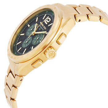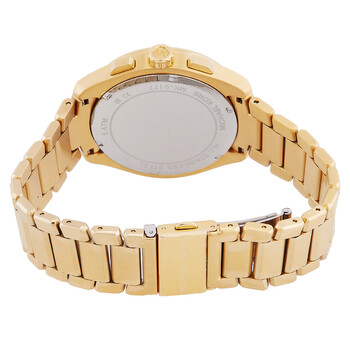 Gold-tone stainless steel case and bracelet. Fixed tachymeter scale gold-tone stainless steel bezel. Black dial with gold-tone hands and index-Arabic numeral hour markers. Minute markers around the outer rim. Dial Type: Analog. Luminescent hands and markers. Date display between 4 and 5 o'clock position. Chronograph - three sub-dials displaying: 60 second, 60 minute and 24 hour. Quartz movement. Scratch resistant mineral crystal. Pull / push crown. Solid case back. Round case shape, case size: 44 mm. Band width: 22 mm. Fold over clasp with a safety release. Water resistant at 50 meters / 165 feet. Functions: chronograph, date, hour, minute, second. Accelerator 2.0 Series. Sport watch style. Michael Kors Accelerator 2.0 Chronograph Quartz Black Dial Men's Watch MK9177.