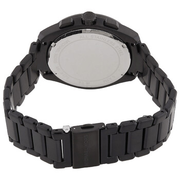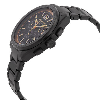 Black stainless steel case and bracelet. Fixed tachymeter scale black stainless steel bezel. Black dial with gold-tone hands and index-Arabic numeral hour markers. Minute markers around the outer rim. Dial Type: Analog. Luminescent hands and markers. Date display between 4 and 5 o'clock position. Chronograph - three sub-dials displaying: 60 second, 60 minute and 24 hour. Quartz movement. Scratch resistant mineral crystal. Pull / push crown. Solid case back. Round case shape, case size: 44 mm. Band width: 22 mm. Fold over clasp with a safety release. Water resistant at 50 meters / 165 feet. Functions: chronograph, date, hour, minute, second. Accelerator 2.0 Series. Sport watch style. Michael Kors Accelerator 2.0 Chronograph Quartz Black Dial Men's Watch MK9179.