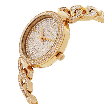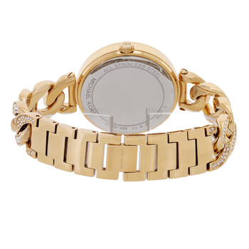 Gold-tone stainless steel case with a gold-tone stainless steel bracelet set with crystals. Fixed gold-tone bezel with crystal set. Glitz dial with gold-tone hands and index hour markers. Dial Type: Analog. Quartz movement. Scratch resistant mineral crystal. Pull / push crown. Solid case back. Round case shape, case size: 38 mm. Water resistant at 50 meters / 165 feet. Functions: hour, minute, second. Catelyn Series. Dress watch style. Michael Kors Catelyn Quartz Crystal Glitz Dial Ladies Watch MK4674.