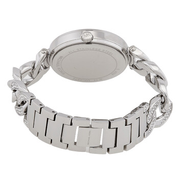 Silver-tone stainless steel case with a silver-tone stainless steel bracelet set with crystals. Fixed silver-tone bezel with crystal set. Glitz dial with silver-tone hands and index hour markers. Dial Type: Analog. Quartz movement. Scratch resistant mineral crystal. Pull / push crown. Solid case back. Round case shape, case size: 38 mm. Water resistant at 50 meters / 165 feet. Functions: hour, minute, second. Catelyn Series. Dress watch style. Michael Kors Catelyn Quartz Crystal Glitz Dial Ladies Watch MK4675.