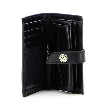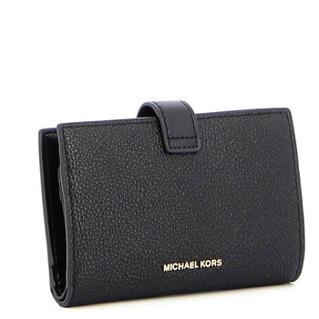Michael Kors Ladies Wallets. SKU: 34S0G00E2L-001. Material: Leather. Color: Black. Size: W 5.51 x H 3.54 x D 1.18 in. Michael Kors Charm Bi-Fold Leather Wallet. This wallet features a grainy leather texture, gold-tone metal details, a bi-fold design, a snap button closure, and card slots. 100% Cow Leather.