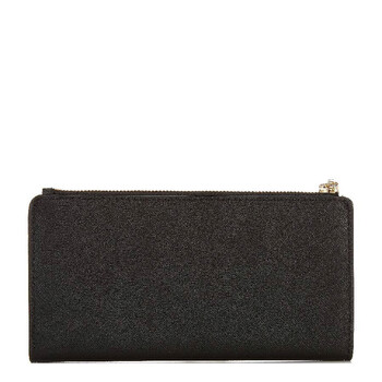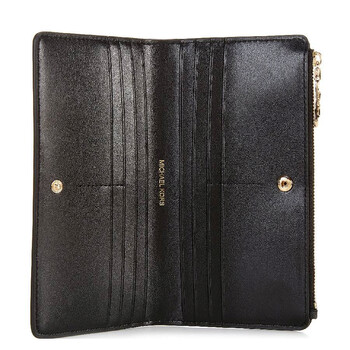 Michael Kors Ladies Wallets. SKU: 32T4G8EF3L-001. Color: Black. Size: 7.5 W x 4 H x 0.75 D. Michael Kors Empire Snap Leather Wallet. This wallet is crafted from Saffiano leather and features a snap closure with gold hardware. The interior includes one back zip pocket, eight card pockets, and four slide pockets, while the exterior has one zip pocket. Material: Saffiano leather.