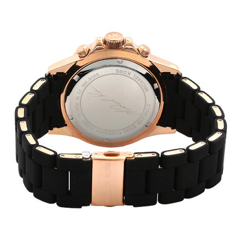 Rose gold-tone stainless steel case with a black silicone strap. Uni-directional rotating black stainless steel bezel. Black dial with rose gold-tone hands and index hour markers. Minute markers around the outer rim. Dial Type: Analog. Date display between 4 and 5 o'clock position. Chronograph - three sub-dials displaying: 60 second, 60 minute and 24 hour. Quartz movement. Scratch resistant mineral crystal. Solid case back. Round case shape, case size: 45 mm. Band width: 24 mm. Deployant clasp. Water resistant at 100 meters / 330 feet. Functions: chronograph, date, hour, minute, second. Everest Series. Sport watch style. Michael Kors Everest Chronograph Quartz Black Dial Men's Watch MK9055.