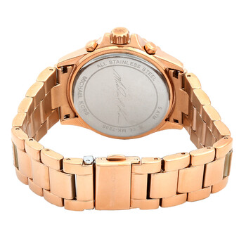 Rose gold-tone stainless steel case with a rose gold-tone stainless steel bracelet set with crystals. Fixed rose gold-tone bezel with crystal set. Rose gold-tone dial with rose gold-tone hands and index-Roman numeral hour markers. Roman numeral marks the 12 o'clock position. Minute markers around the outer rim. Dial Type: Analog. Luminescent hands and markers. Date display between 4 and 5 o'clock position. Chronograph - three sub-dials displaying: 60 second, 30 minute and 24 hour. Quartz movement. Scratch resistant mineral crystal. Pull / push crown. Solid case back. Round case shape, case size: 36 mm. Band width: 20 mm. Deployment with push button release clasp. Water resistant at 50 meters / 165 feet. Functions: chronograph, date, hour, minute, second. Everest Series. Dress watch style. Michael Kors Everest Chronograph Quartz Crystal Rose Gold Dial Ladies Watch MK7235.