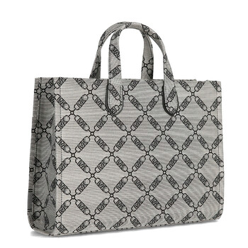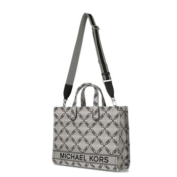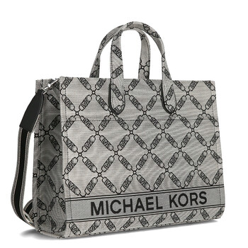Michael Kors Ladies Tote. SKU: 30S3S3GT3J-006. Barcode: 196163827131. Color: Nat/Blk. Size: 15.5"W X 11.75"H X 5.25"D. Michael Kors Ladies Nat / Blk Gigi Large Empire Logo Jacquard Tote Bag. The Gigi tote features an allover logo chain jacquard pattern with Empire logo jacquard detailing. It has a rectangular shape and a handle drop of 4.5 inches. The exterior includes a front slip pocket, while the interior boasts a back zip pocket and two front slip pockets. Silver-tone hardware complements the design. 53.2% Cotton/46.8% Polyester.